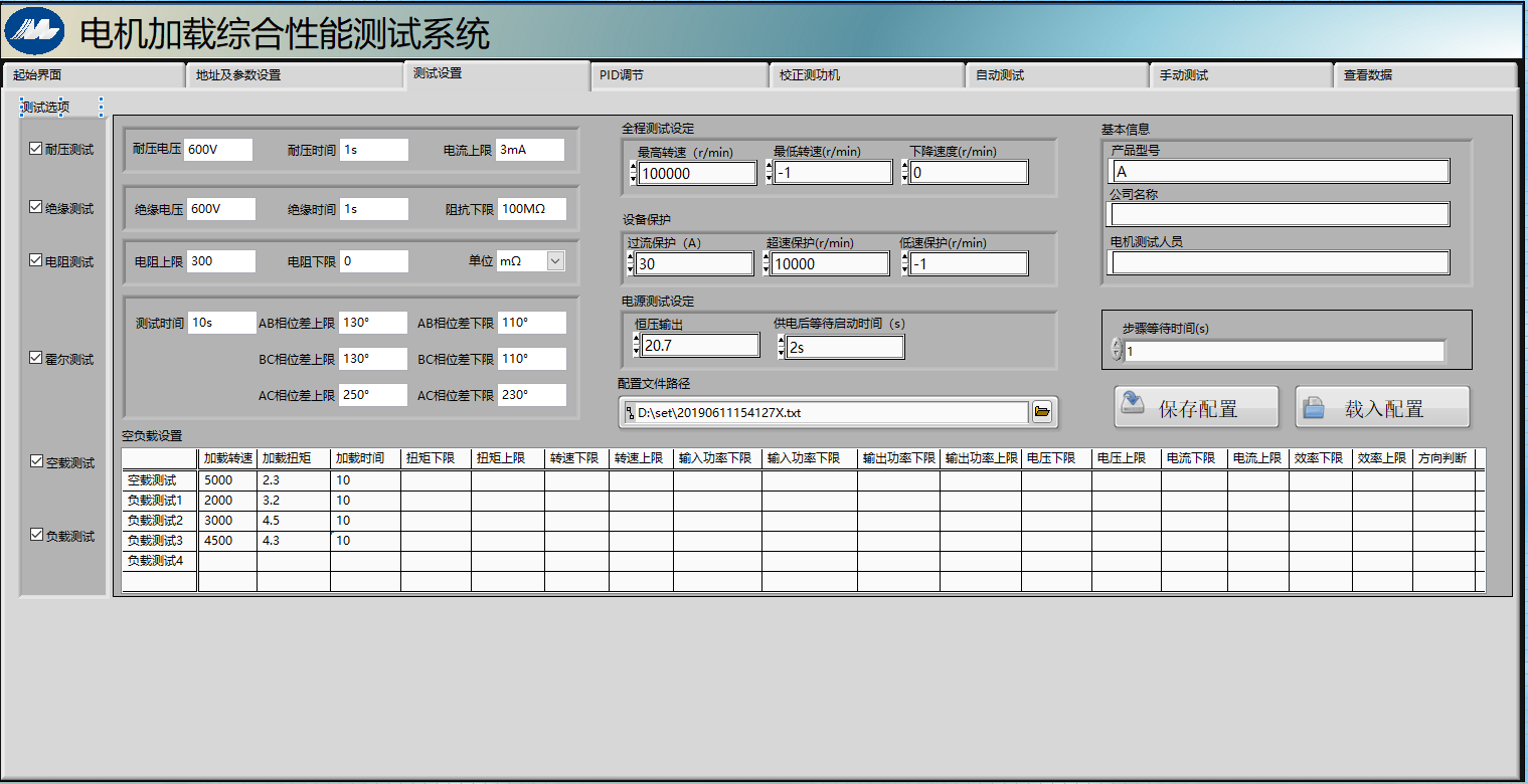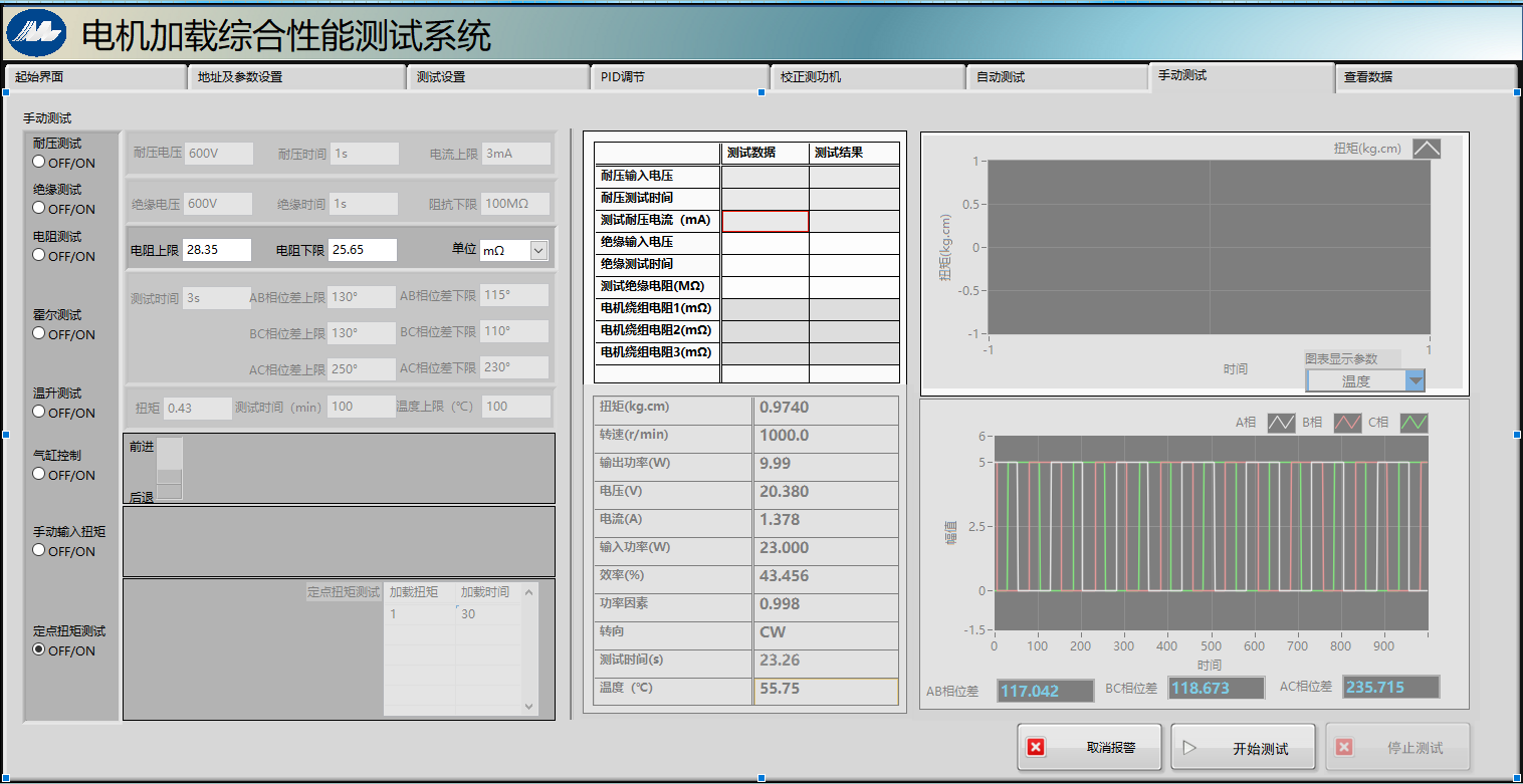 3.負載測試:測試電機在不同負載下的扭矩,轉速,電壓,電流,功率,并且判斷是否合格